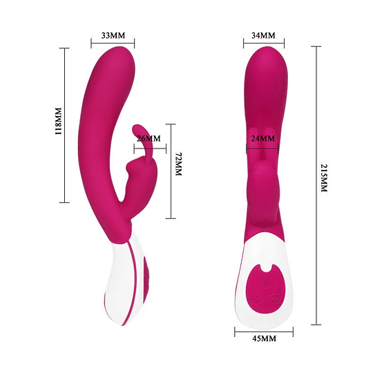 Este estilizado diseño satisfará tu más profundos deseos. Es un vibrador tipo conejo con 2 motores que se controlan individualmente.